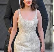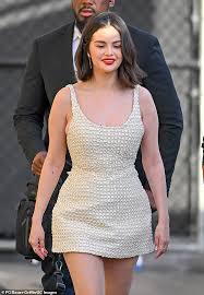 Selena Gomez turned heads in Hollywood on Monday afternoon as she headed into El Capitan Entertainment Center to pre-tape Jimmy Kimmel Live! Her outfit featured a chic white mini-dress with a chainmail-style beaded overlay and exaggerated peplum, adding an edgy yet elegant touch. The dress was paired with white ankle-strap pumps, carefully selected by her stylist Erin Walsh.