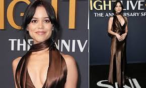 Jenna Ortega commanded attention on the red carpet at the SNL 50th Anniversary Special at Rockefeller Plaza in New York City. The 22-year-old actress stole the spotlight in a flirty ensemble that made a bold statement as the event wrapped up a star-studded weekend. She looked ethereal in a rich chocolate brown satin gown that hugged her petite frame, featuring a plunging draped neckline that added an extra touch of allure to her already stunning look.