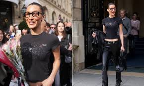 She paired the casual T-shirt with sleek black jeans and finished off the look with a stylish bag and simple accessories, exuding cool, laid-back vibes. Her signature long, flowing hair framed her face, and her fresh-faced makeup completed the effortlessly chic ensemble. Bella’s Parisian outing was a perfect blend of street style and high fashion.