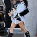 Kourtney Kardashian spotted in public adorning oversized button-up shirt in lieu of traditional trousers, with her son, Rocky.