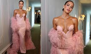 The founder of the Good American brand, Ms. Kardashian marked her 41st birthday on the same day as the high-profile event. For the occasion, she appeared in a strapless, baby pink sequin gown complemented by a matching feathered wrap.