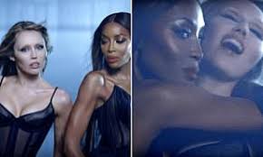In the concluding scenes of the music video, both Ms. Naomi Campbell and Ms. Miley Cyrus appear in provocative black lingerie, striking multiple poses together before exiting the frame jointly as the video comes to an end.