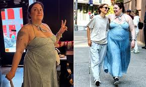Ms. Dunham, aged 39, appeared in casual attire, wearing a ‘Draped Denim Slip’ maxi dress by GapStudio, retailing at approximately $148, along with a coordinating blue neckerchief and black Nike sneakers. Her outfit also revealed her tattooed arms.