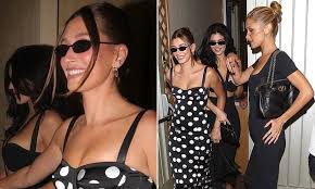Attired in a form-fitting, monochrome, polka-dot dress that accentuated her slender physique, Mrs. Hailey Bieber was observed smiling while holding hands with Ms. Kylie Jenner upon arrival at the aforementioned restaurant. Notably, Mrs. Bieber wore her wedding band on her left hand, alongside various accessories, including a pair of dark sunglasses worn during nighttime hours.