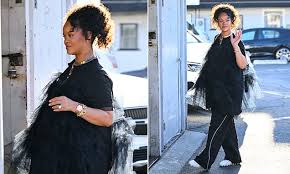 During the aforementioned public outing, Ms. Robyn Rihanna Fenty was attired in a collarless, short-sleeved top extending to her thighs, the otherwise simple garment accentuated with layers of sheer black tulle that served, in part, to obscure her pronounced pregnancy. For purposes of comfort, she paired the top with black track pants featuring a white side stripe, while contrasting the ensemble with white footwear.