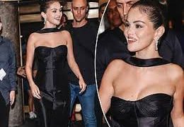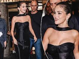 For the outing, Ms. Gomez elected to wear a strapless black dress incorporating corsetry and a low neckline, accentuating her décolletage. Her appearance was further styled with slicked-back hair, defined makeup, and the addition of a black scarf draped around her neck, collectively evoking a retro-inspired aesthetic.
