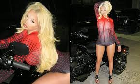 The 19-year-old posed in a form-fitting Shane Justin bodysuit, which featured long sleeves and a cheeky cut, highlighting her toned figure. In one image, she perched atop a Harley Davidson three-wheeler, while in others she posed against a row of luxury SUVs parked outside her father’s residence.